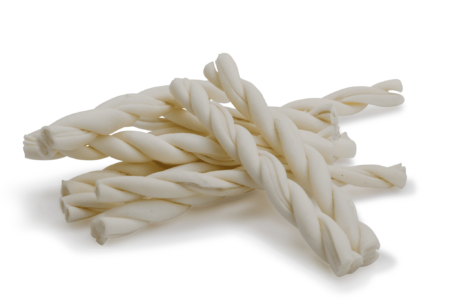 Rawhide er tørret underhudsvæv (det andet, stærke lag) af kvægets hud. Vores hvide tyggeben er importeret fra Europa og er fremstillet af hudene fra fritgående kvæg, som avles til den lokale kødproduktion. Da produktionsselskabet er en del af et stort slagtehus, bliver hudene mekanisk delt umiddelbart efter slagtningen. Under processen for læderproduktion fjernes det ydre ufordøjelige lag. De indre lag, som består af fordøjeligt, subkutant bindevæv, vaskes og skæres i stykker i den ønskede størrelse. Efter at de er manuelt foldet i mange forskellige former, ovntørres de hvide tyggeben i flere døgn. Et meget vigtigt aspekt ved vores produkter er den hurtige forarbejdning, som indebærer, at der ikke bruges skadelige stoffer under hele produktionsprocessen. Derfor kan vi garantere et rent, ublandet og sikkert produkt.